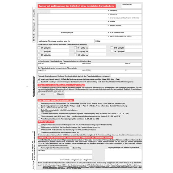 Bestellen Sie jetzt und erleichtern Sie den Prozess der Fahrerlaubnisverlängerung mit unserem praktischen Antragsformular.