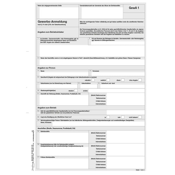 Unsere GewA 1 Gewerbeanmeldung ist das perfekte Werkzeug für alle, die ihre Arbeitsprozesse optimieren und ihre Effizienz steigern möchten. Mit ihrem praktischen DIN A4 Format passt sie perfekt in jede Akte und ist somit immer griffbereit. Jedes Blatt ist beidseitig bedruckt, sodass Sie alle wichtigen Informationen auf einen Blick haben. Mit 1000 Stück pro Packung sind Sie bestens ausgestattet und können sich auf das Wesentliche konzentrieren: Ihr Geschäft.