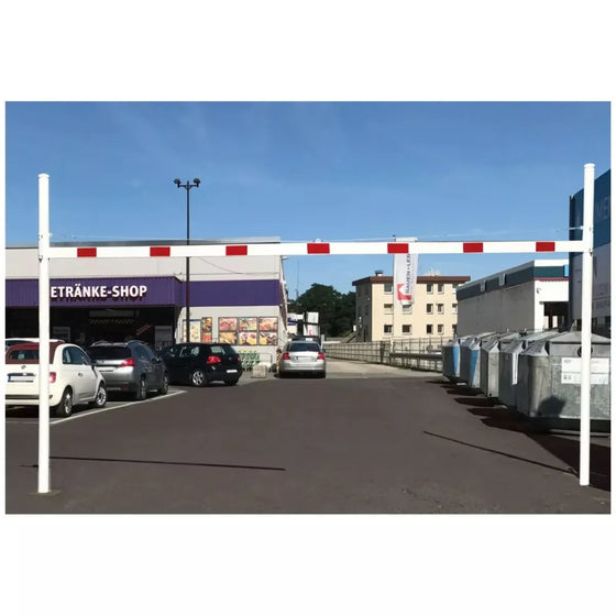 Technische Details: - Gesamthöhe: ca. 3000 mm - Durchfahrtsbreite: 5000 mm - Durchfahrtshöhe einstellbar von 1800 - 2800 mm - Farbe: Weiß mit rot reflektierenden Streifen