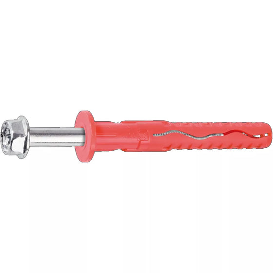 Eigenschaften: Die Dübel bestehen aus halogenfreiem Nylon und verfügen über eine Eindrehsicherung am Dübelhals sowie eine verstärkte Kontur am Dübelschaft. Sie werden komplett mit Sechskantschrauben und angepresster Unterlagscheibe geliefert. Der Schraubenantrieb beträgt SW13 bei KL 10 und SW17 bei KL 14.