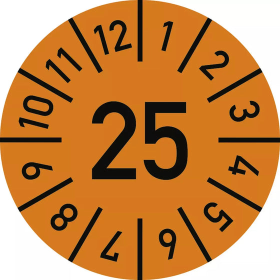 Unsere Prüfplakette Jahr 25 ist die ideale Lösung für eine effektive und übersichtliche Kennzeichnung Ihrer Prüfobjekte. Die Plakette ist aus selbstklebender Folie gefertigt und besticht durch ihre auffällige orange Farbe. Mit einem Durchmesser von 10 mm ist sie gut sichtbar und dennoch platzsparend. Sie erhalten die Plakette in einer praktischen Lieferform von 10 Stück pro Bogen.