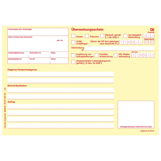 Unsere Überweisungsscheine für Kassenärzte sind mehr als nur ein Stück Papier. Sie sind ein wichtiges Instrument für eine reibungslose Kommunikation zwischen Ärzten und ein Zeichen für Professionalität. Mit einer Größe von 210 x 148 mm (A5 quer) passen sie perfekt in jede Praxis und sind leicht zu handhaben. Die 2-farbige Gestaltung sorgt für eine klare Struktur und erleichtert das Ausfüllen. Jede Packung enthält 25 Stück, sodass Sie immer genug Vorrat haben.
