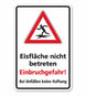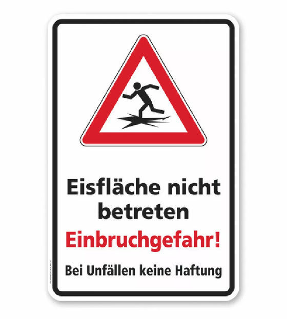 Klare Warnung vor Einbruchgefahr: Das Verkehrszeichen WH-E-13 mit der Aufschrift Eisfläche nicht betreten Einbruchgefahr! Bei Unfällen keine Haftung warnt deutlich vor den Risiken, die das Betreten von unsicheren und gefrorenen Eisflächen mit sich bringt. Diese klare Botschaft trägt dazu bei, Menschen vor potenziell tödlichen Situationen zu schützen und Unfälle zu verhindern.